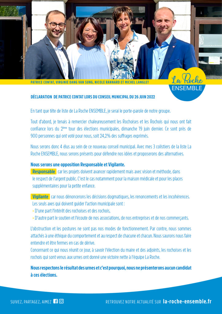 « Dimanche 12 juin, lors du premier tour des élections municipales à la Roche Sur Foron, Mme Degrasset et des personnes de sa liste La Roche Autrement ont fait acte de campagne en allant au-devant des électeurs. Malgré plusieurs demandes pour qu’ils arrêtent, ils ont continué à solliciter des citoyens qui venaient voter. Ces derniers et les personnes présentes ont été choquées par ce comportement.